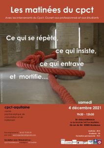 MATINEE DU CPCT : CE QUI SE RÉPÈTE, CE QUI INSISTE, CE QUI ENTRAVE ET MORTIFIE – 4 Décembre 2021 cpct2017Admin 2021-11-09T12:02:15+01:00 mardi 9 novembre 2021| Partagez cette actualité sur les réseaux sociaux FacebookTwitterLinkedinRedditTumblrGoogle+Email Précédent